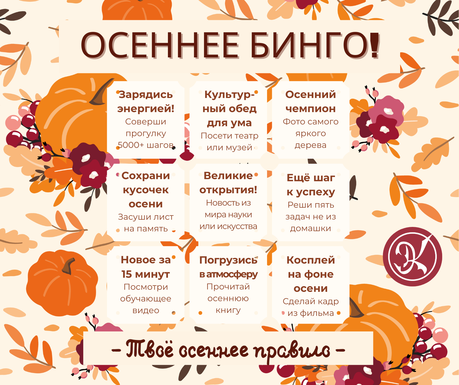 Друзья! Осень — это не только дожди и холода, но и время ярких красок, уютных вечеров и новых открытий. Чтобы это время прошло максимально интересно, мы запускаем общешкольный осенний челлендж в формате БИНГО!