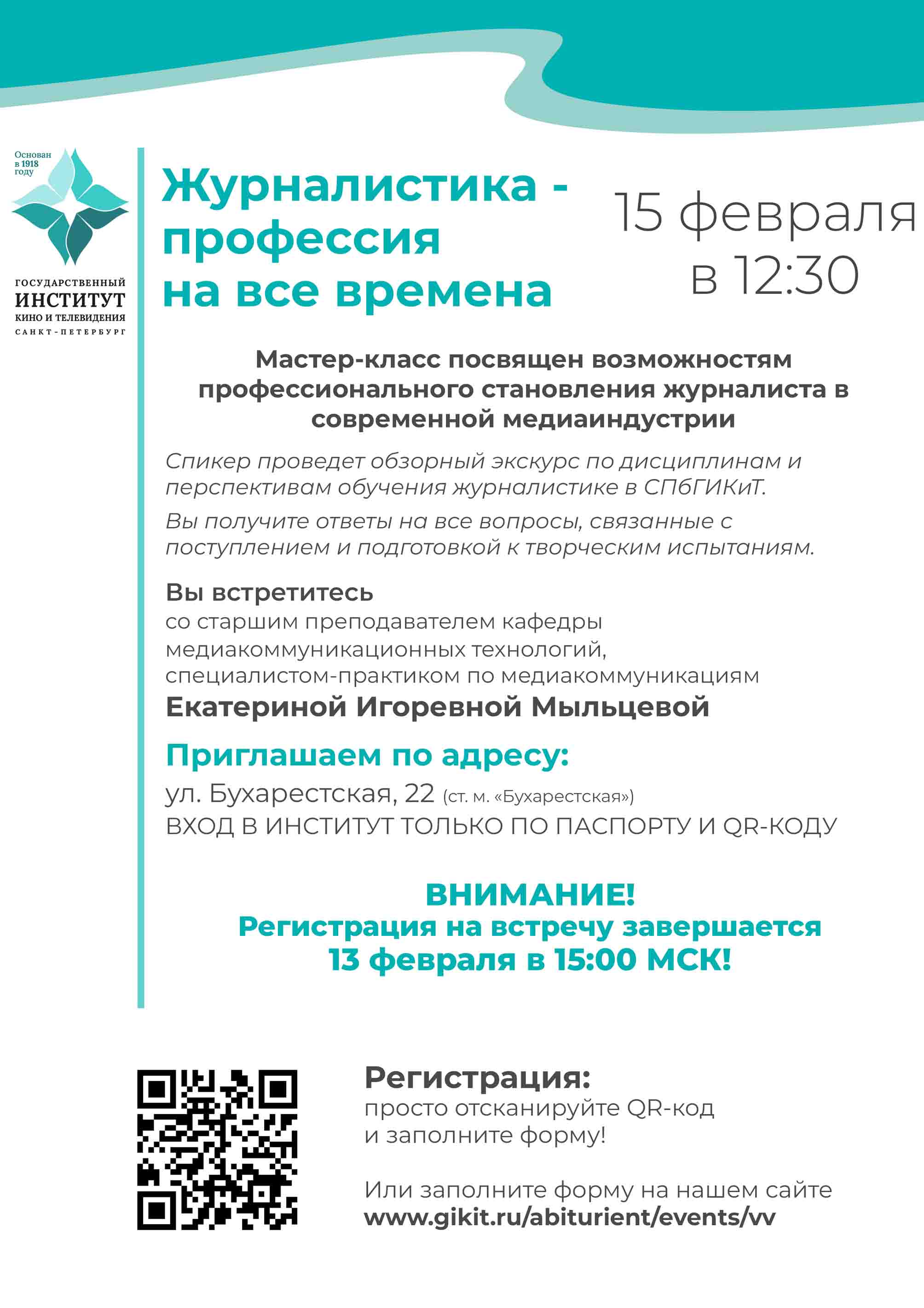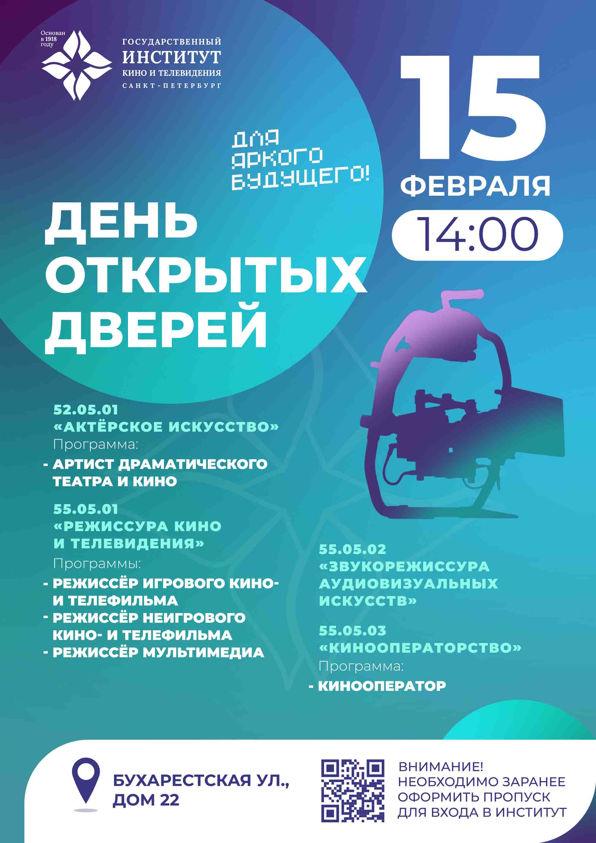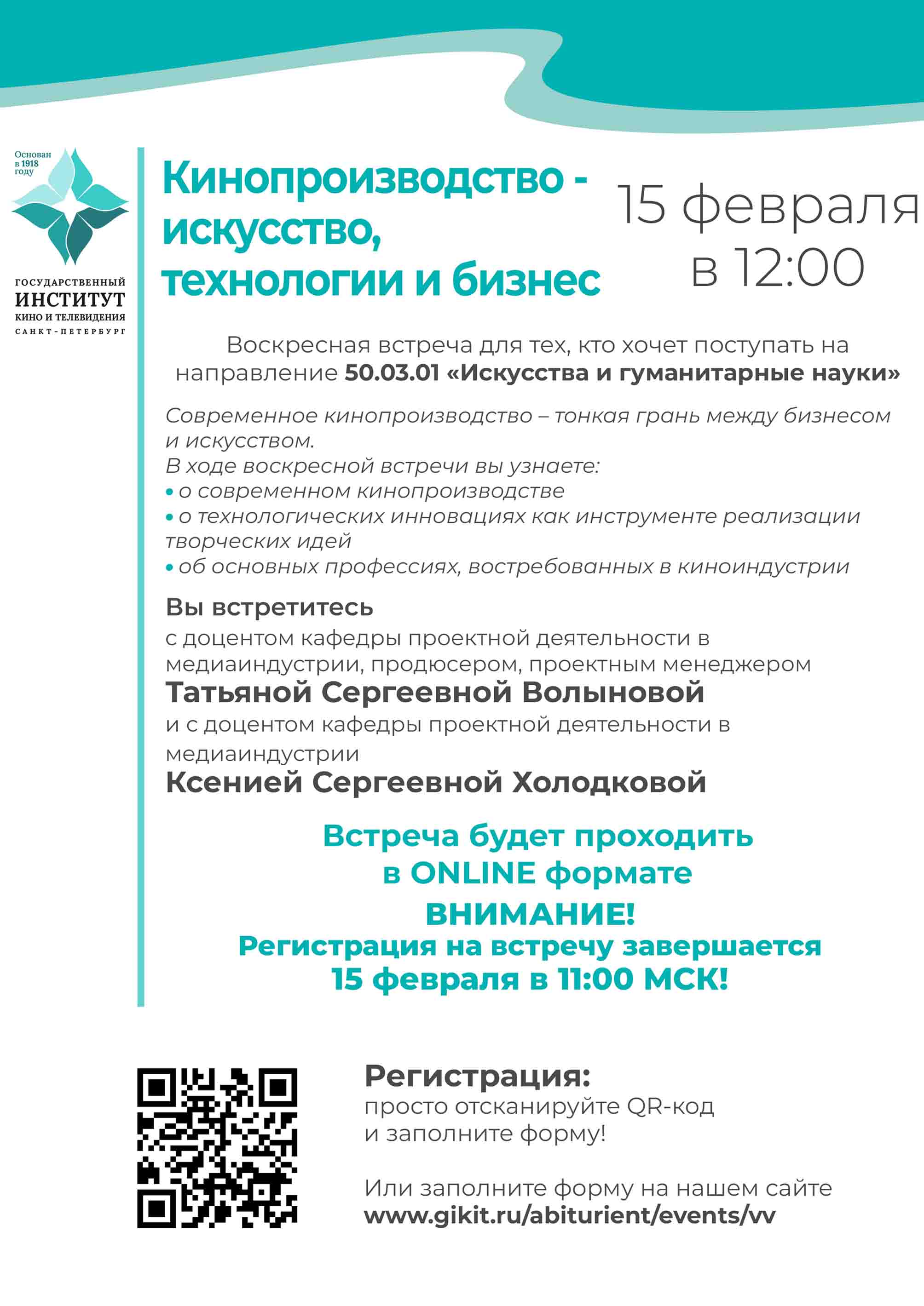 Санкт-Петербургский государственный институт кино и телевидения приглашает абитуриентов на Воскресные встречи и День открытых дверей!